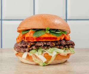 2 x wołowina smash, 2 x bekon, 2 x cheddar, krążki cebulowe, jalapeno, cebula, sriracha mayo