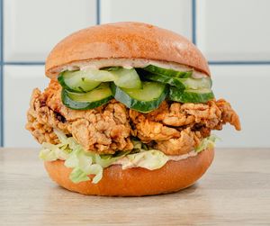Kurczak panierowany w stylu jerk, sos limonkowy jerk, piklowany ogórek, sałata lodowa, dressing cytrusowy