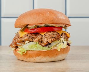 Szarpana wieprzowina, 2x cheddar, sałata lodowa, pomidor, ogórek konserwowy, przyprawa jerk, dressing cytrusowy, majonez paprykowy.