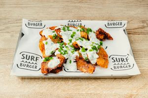 180 gramów wołowiny, ser cheddar, sałata lodowa, czerwona cebula, pomidor, marynowana papryka jalapeno, nachosy, gorący sos serowy, sos BBQ