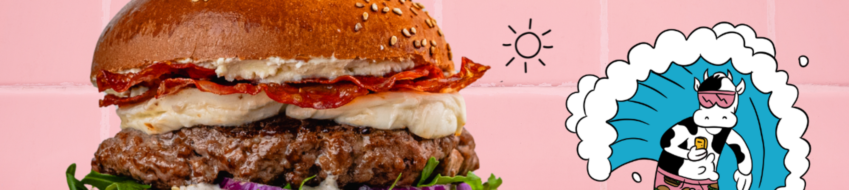 kotlet roślinny Beyond, cheddar Violife, sałata lodowa, czerwona cebula, pomidor, ogórek kiszony, wegańskie sosy: majonez, BBQ, wegańska brioche.