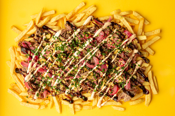 Frytki, Szarpana wieprzowina, piklowana cebula, cheddar, sriracha, mayo, sos BBQ, szczypiorek